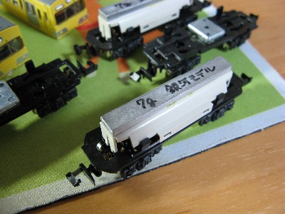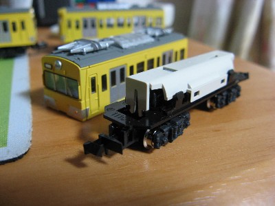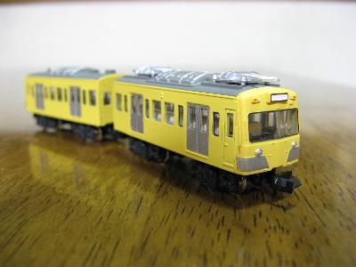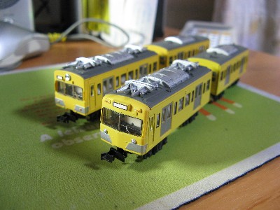 模型は、Bトレインショーティーの西武鉄道101系をストレートに組み立てて、Nゲージ化したもの。ただし製品が旧塗装(イエローに窓回りベージュ)のツートンカラーだったので西武イエローで再塗装してある。ドアの銀色を残すために、ドア部分のみマスキングテープにてマスキングして塗装した。職場で昼休みの間に工作したので、その時の作業風景の写真は取り忘れた。