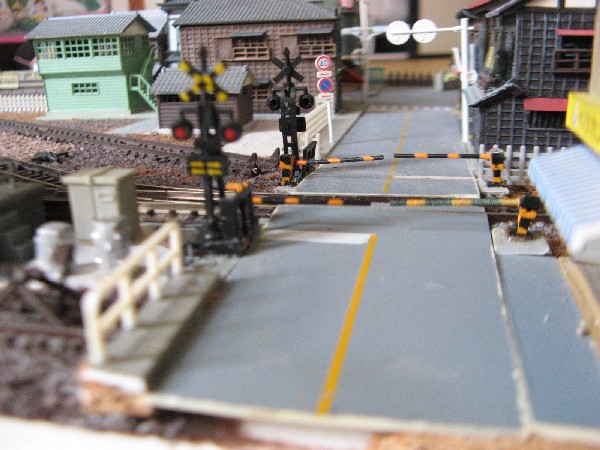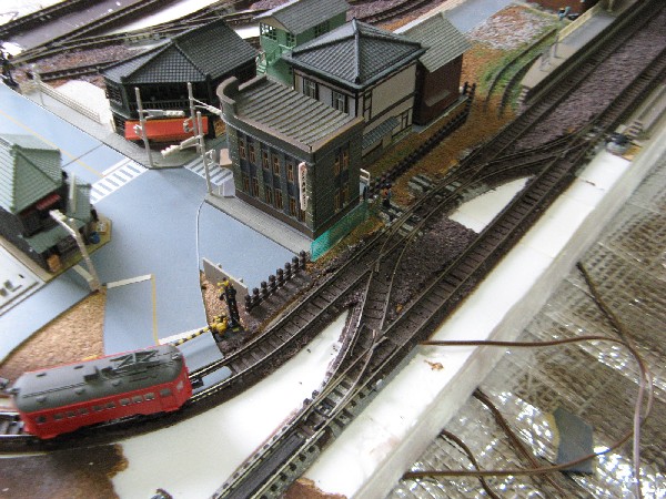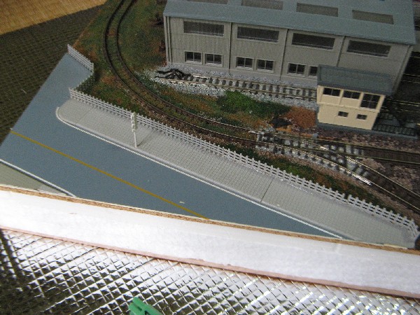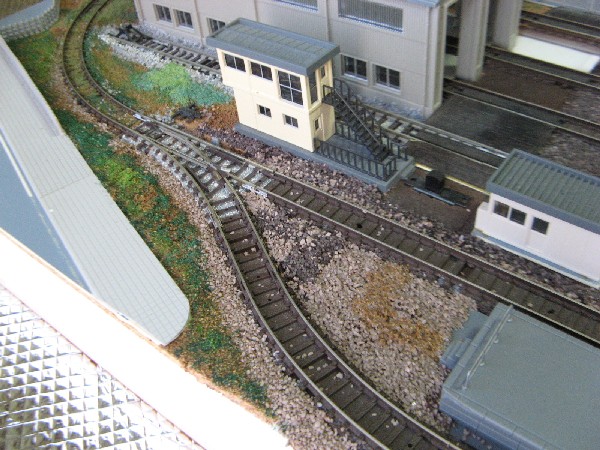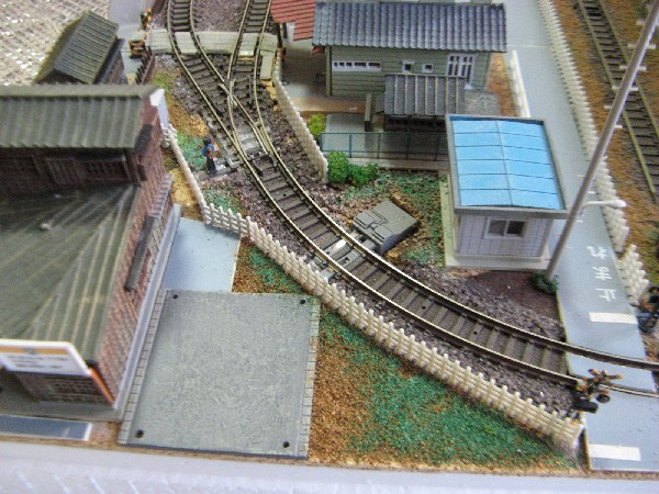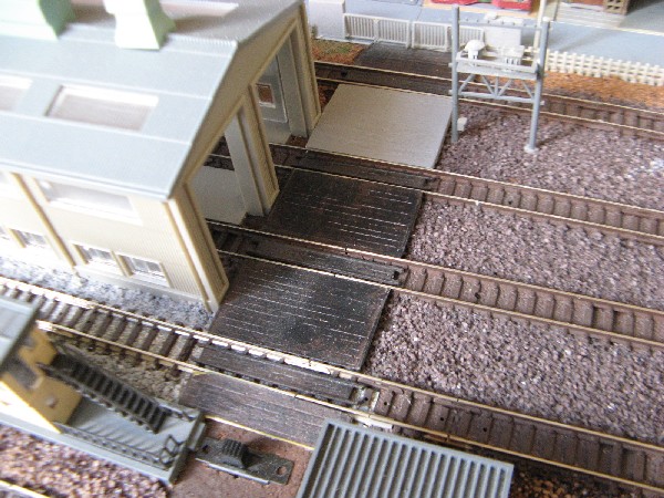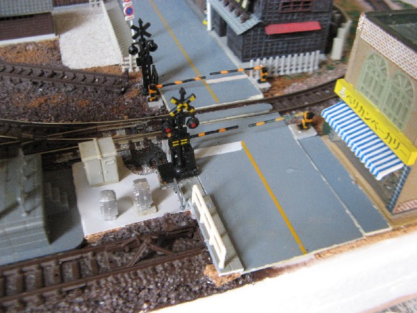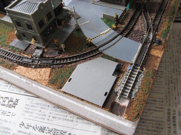 作業後の写真です。踏切とプラットホームの間の空き地は、継電器箱とキュービクルを設置して駅関係および踏切関連の制御機器が設置されているという想定にしてあります。