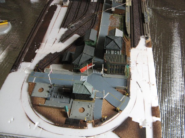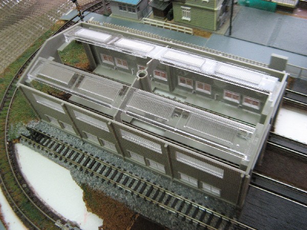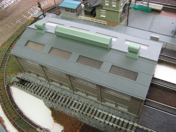 車庫はトミックス製の機関車庫を利用しています。実はこの車庫、屋根が固定されているので車庫内のレールがよこれていても掃除することが出来ません。そこで今回の更新作業で、車庫の屋根を取り外しできるようにします。
