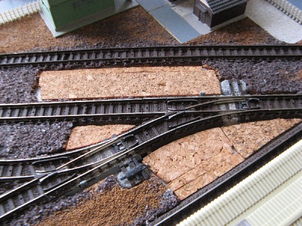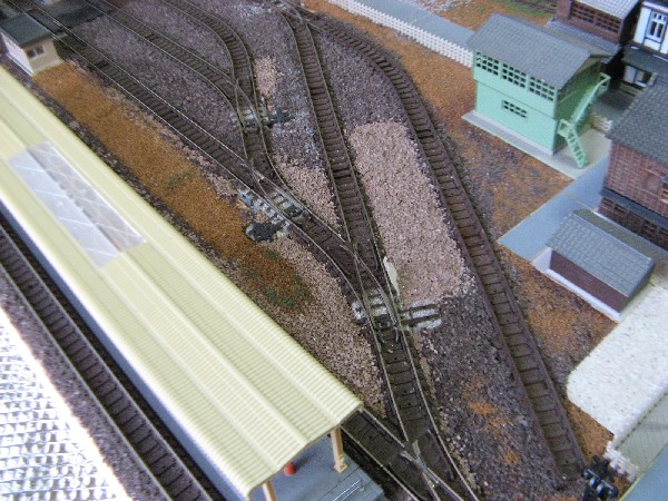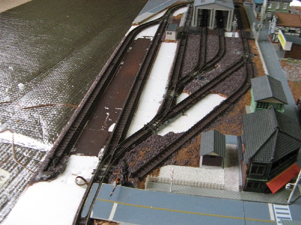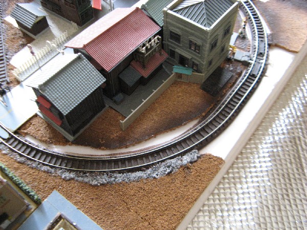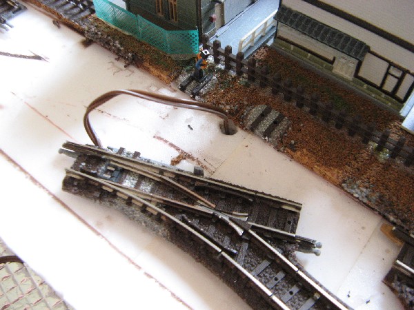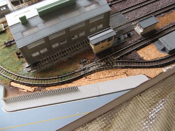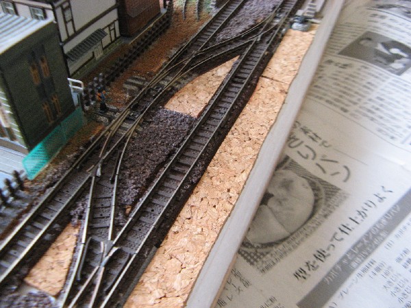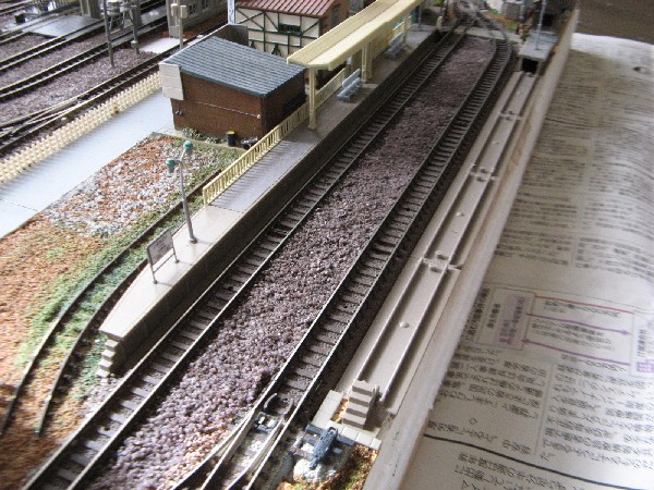 一番最初にこのレイアウトを制作したときに使用したバラスト(ダークブラウン色)が手持ちでないので、代替え品のバラスト(ブラウン色)で作業をしました。したがってバラストの色があっていません。どうせ色が合わないのなら、新品のバラストが散布されたという想定でグレーのバラストを散布してもよかったのですが。