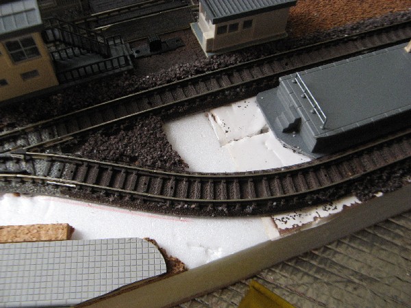 ポイントを取外すためには、カーブ区間までレールを取外す必要が・・・。それとストラクチャーの建物も作業の邪魔になったので取外してあります。