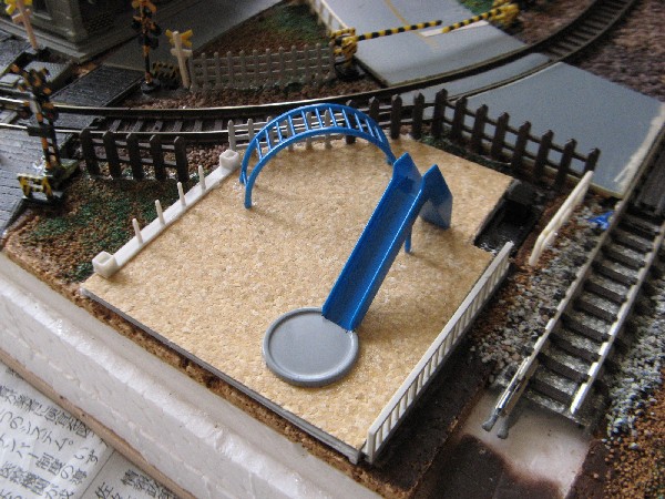 児童公園のアップ写真です。「うんてい」と「滑り台」を設置しました。ともにトミックス製の「複線高架橋脚ガード下児童公園」に入っていたストラクチャーを流用したものです。この児童公園は両脇に線路があるのでトレインビューにはもってこいの場所です。ママ鉄の人気スポットになりそうです。
