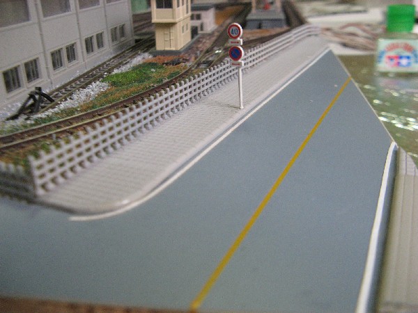 道路の白線および歩道部分の柵・道路標識を取り付けたあとの写真です。作業前の写真を取り忘れたので、過去のブログ記事の写真を参照してください。