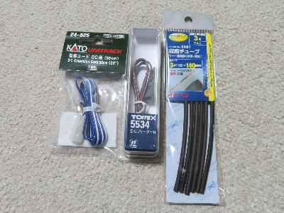 写真左から、カトー製:延長コード、トミックス製:フィーダー線、収縮チューブ