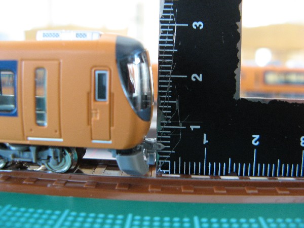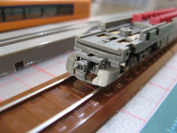 写真でご覧の通り、TNカプラーの取り付け位置が悪く、車体電面よりカプラーが引っ込んでいます。これでは連結する前に車体同士が接触してしまうので、連結器で車両をつなぐことが出来ません。