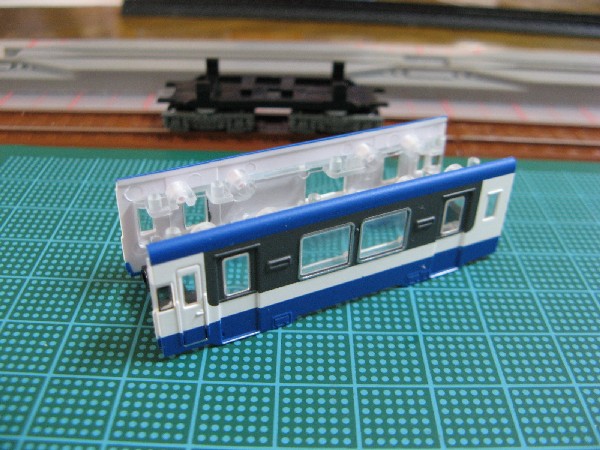 先頭車両を車体と床板に分解してダミーカプラーを床板から外しておきます。