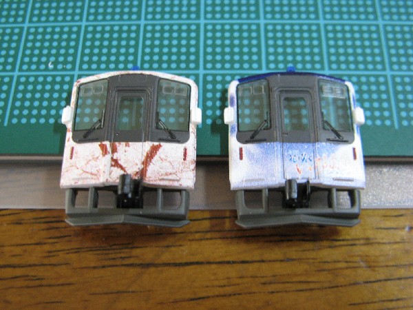 左の車両が中間車化された先頭車です。貫通路扉が撤去されて無いのと、正面の赤い塗装が省略されています。